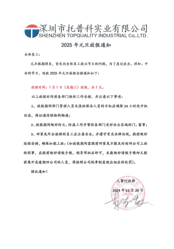 祥龍賀瑞辭舊歲,玉兔回宮迎新年!值此元旦佳節來臨之際,根據國家法定節假日規定,并結合本公司實際情況,現將元旦放假安排通知如下: